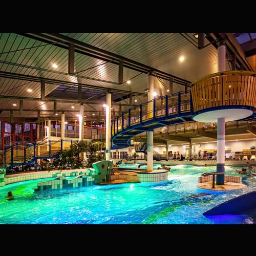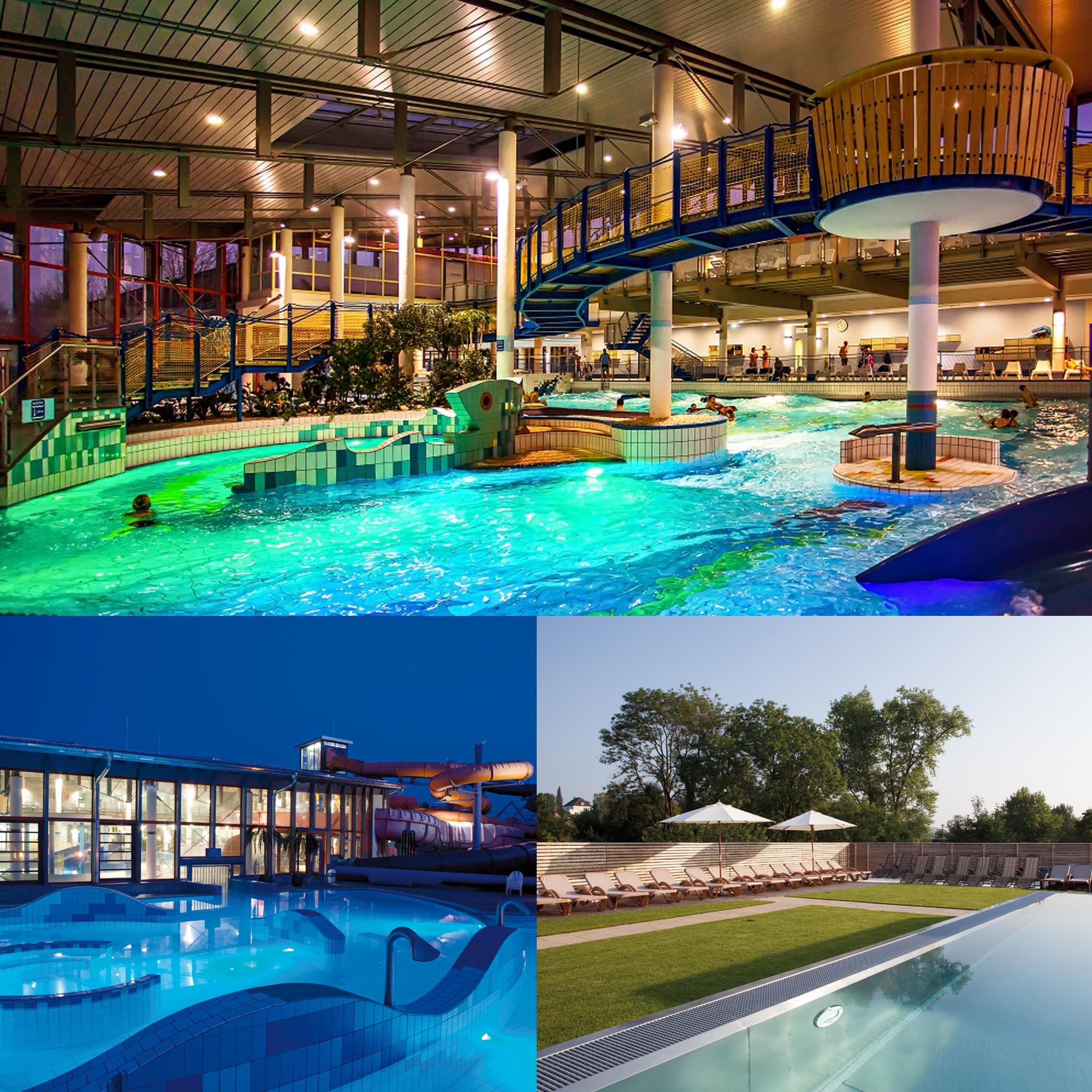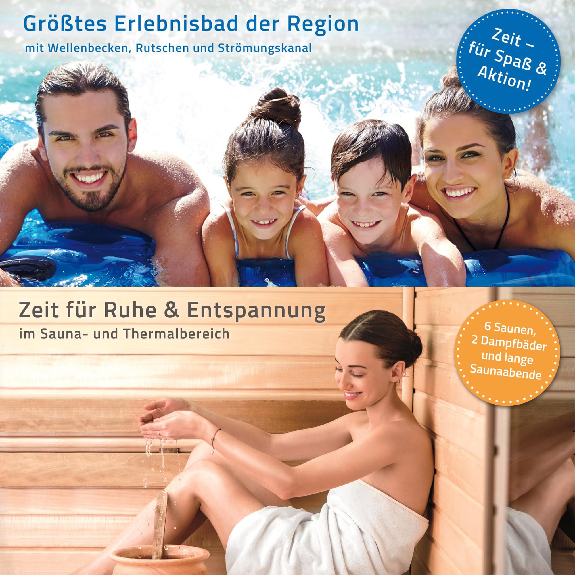 Zeit für Spaß&Action im Erlebnisbad mit Wellenbecken, Rutschenanlage (3 Rutschen), Strömungskanal, Entspannungsbecken, 25-m-Schwimmerbecken, Dampfbad und Kleinkinderbereich. Bei etwa 36 Grad warmem Thermalwasser stehen im Thermalbereich auch zwei weitere Becken mit Sprudelliegen sowie Massagedüsen zur Verfügung. Für Familien lohnt sich besonders der Familientag am Freitag und für Sportler der Sportschwimmertarif.